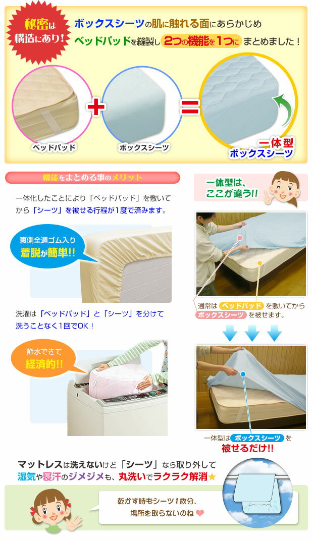 綿平織り一体型ボックスシーツ 商品説明 肌に触れる部分に中綿をたっぷり挟み、ベッドパッドとボックスシーツの機能を1つに兼ね備えてたアイディア商品です。