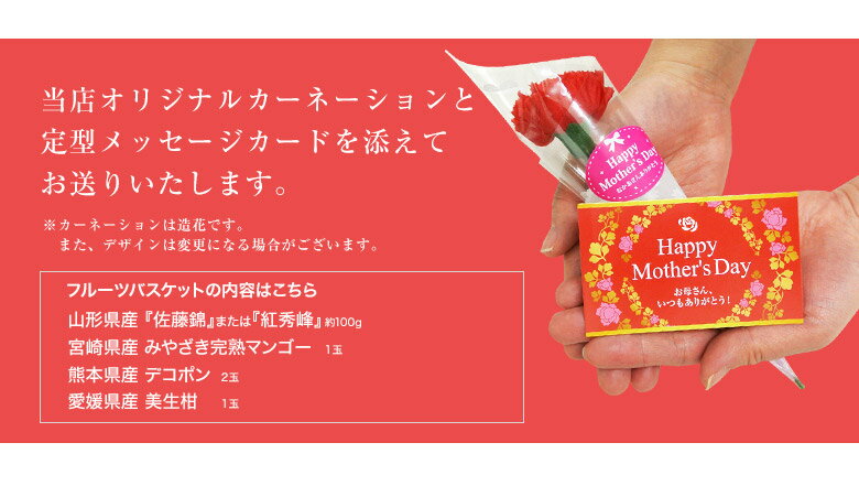 商品名 配送業者 母の日フルーツカゴ盛り3種4品 ●山形産 佐藤錦100g ●愛媛産 美生柑2玉 ●宮崎産 完熟マンゴー Lサイズ 1玉(1玉310g〜349g) ※入荷状況によりまして2Lサイズへ代替させて頂くことがございます。